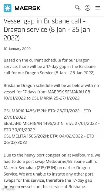 马士基:停止挂靠布里斯班港17天