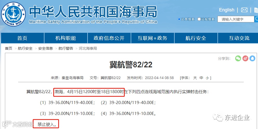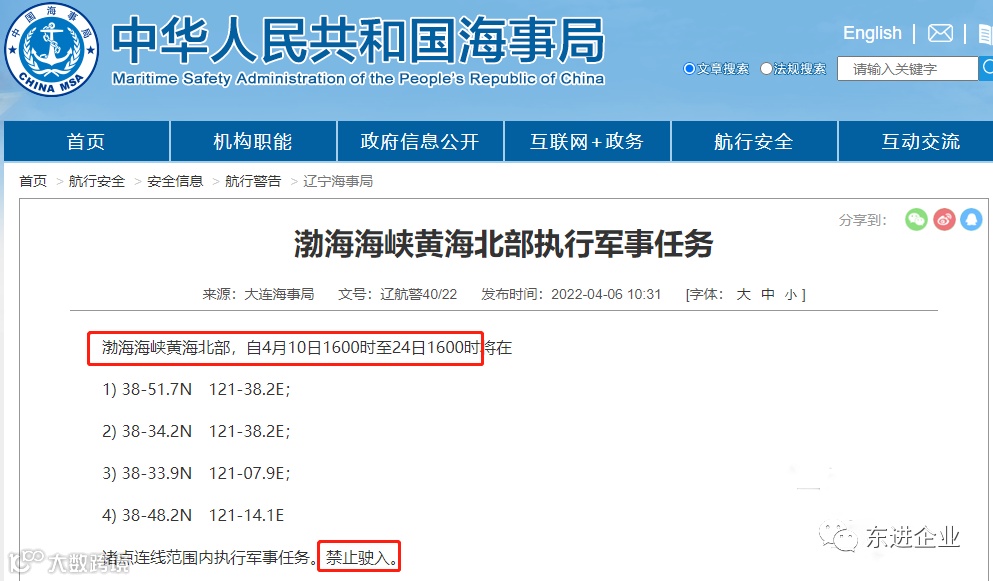 据大连海事局 :渤海海峡黄海北部,自4月10日1600时至24日1600时将在