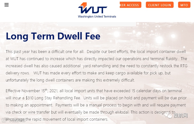 该码头宣布,自11月15日起,对所有在码头停留超过15个自然日的本地进口集装箱,收取310美元的长期停留再处理费( Long Stay Rehandling Fee)。