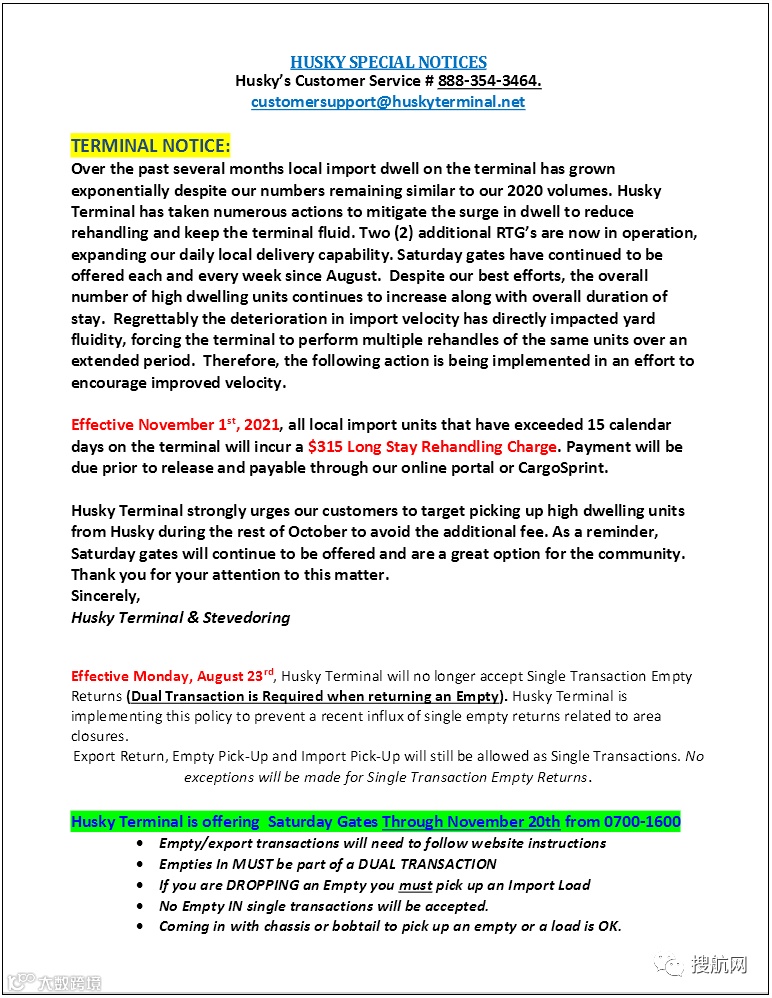 从11月1日起,对所有在码头上停留超过15个自然日的本地进口集装箱,收取315美元的长期停留再处理费(Long Stay Rehandling Charge)。