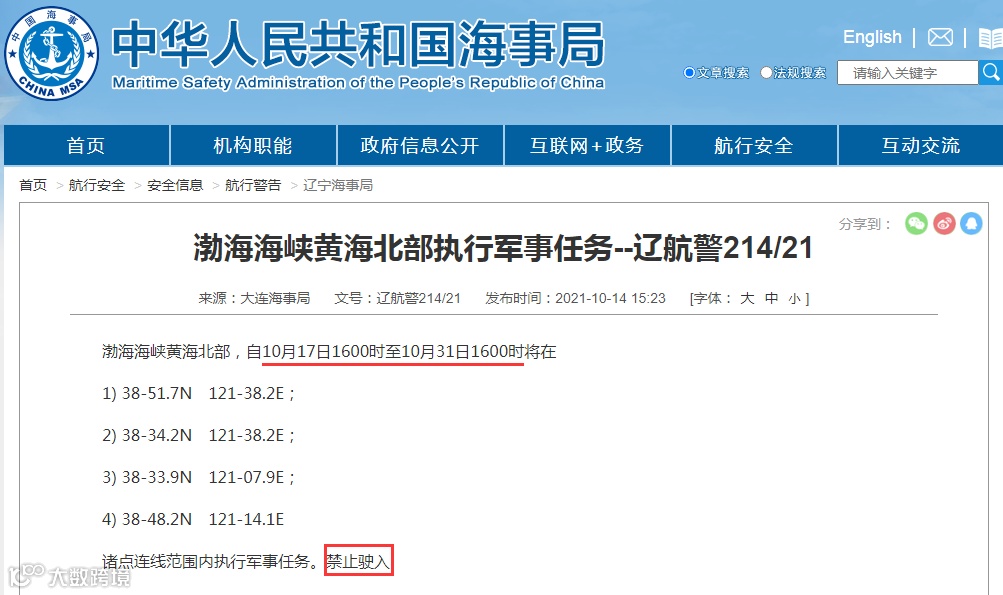 据大连海事局消息:渤海海峡黄海北部,自10月17日1600时至10月31日1600时将在