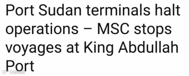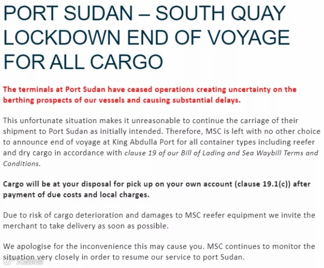 10月20日,MSC发布通知称苏丹港的码头已停止运营,给船只靠泊带来不确定性以及造成大量延误。