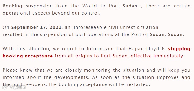 提醒:由于苏丹局势不稳,船公司及相关客户务必继续密切关注进展,以便第一