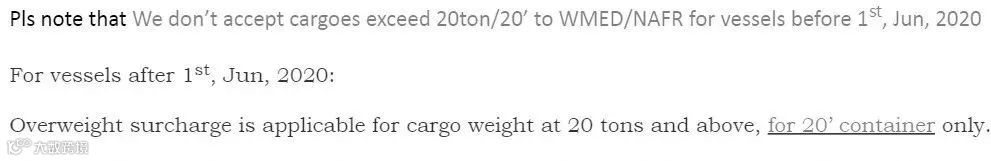 MSC地西&北非更新OVW费用小箱货重超20TONS(含20TONS)收取USD200。