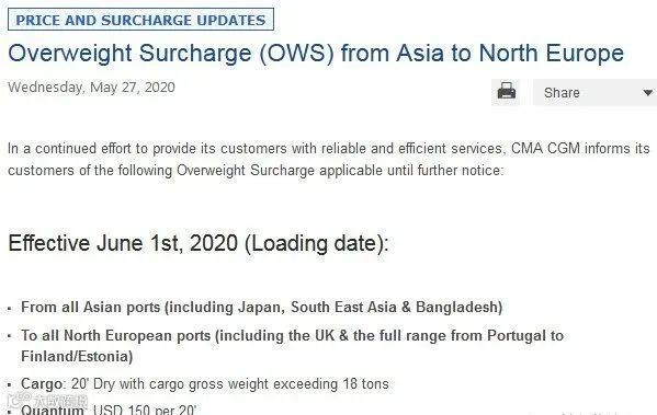 6月1日起,CMA欧洲OWS,超过18TONS及以上(不含箱重)收取USD150。