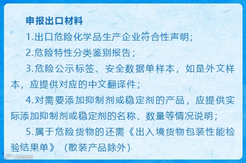 出口危险化学品的发货人或者其代理人向海关申报时,按照《目录》中的名称申报,同时还应提供下列材料: