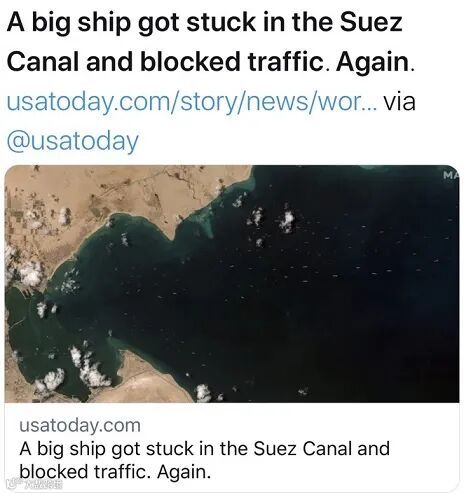 苏伊士运河因“长赐轮”阻塞导致全球航运混乱,周四(9月9日)苏伊士运河再次传来“卡船搁浅”意外。据多家外媒报道,一艘悬挂巴拿马旗的货船周四进入苏伊士运河后33英里处双航道河段搁浅,导致当局不得不将其他船只转向另一条航道。