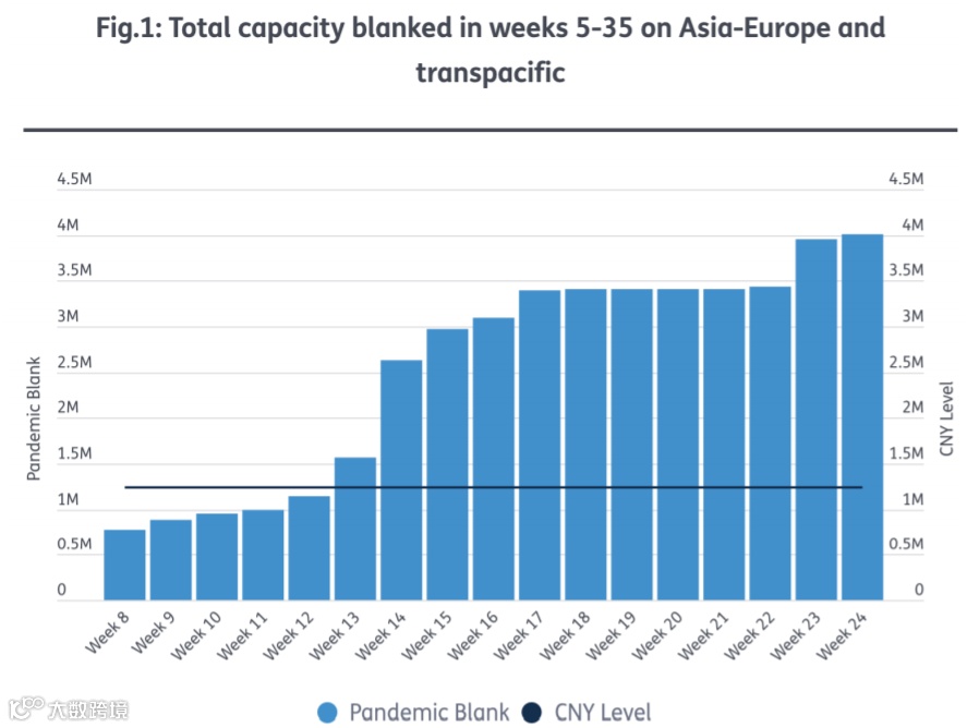 换句话来说,跨太平洋航线停航运力将达到420,000TEU,而亚洲-欧洲航线停航运力将达到790,000TEU。
