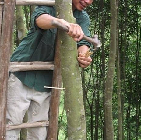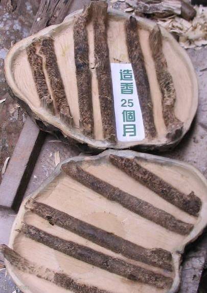 在东南亚地区,森林里的土著采香人习惯在寻香过程中,随机地用采香刀在途经的香树上砍出伤口,促使香树结香,这样在好多年后,他们的子孙也会有香可采了。这样的沉香,也应该算做野生沉香,就是我们俗称的“生结”。但眼下再用这样的传统方式,市场已经等不及了,利益的驱动,需要短时间内批量制造出“沉香“。于是,在香树上打洞、打钉子、火烧、涂抹真菌以及使用沉香诱导剂,成为当下最热门的人工造香方式,这样,大约两年时间就可以初步出香了。