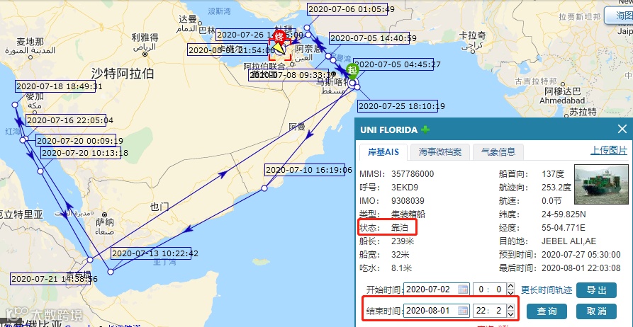 截止8月1日晚10时,“UNI FLORIDA”轮仍停泊在杰贝阿里港。各位货代货主朋友注意!该事故会造成船期一定延误,请及时关注船舶动态!如果有货物配载在该轮中转的,请及时关注船公司最新消息!