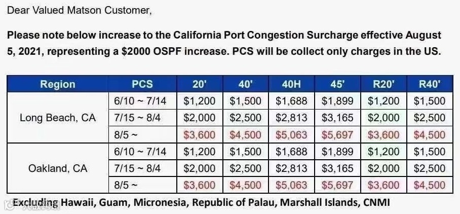 美森轮船上周宣布,从8月5日开始对美西港口再次增加港口拥堵费2000美元每柜。