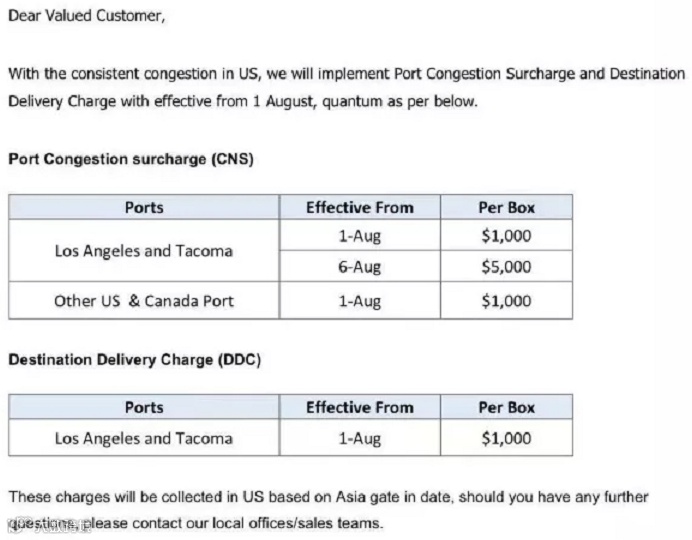 近日,以星船公司也发出通知,由于美国拥堵,将征收码头拥堵费和交货费,8月1日起生效。