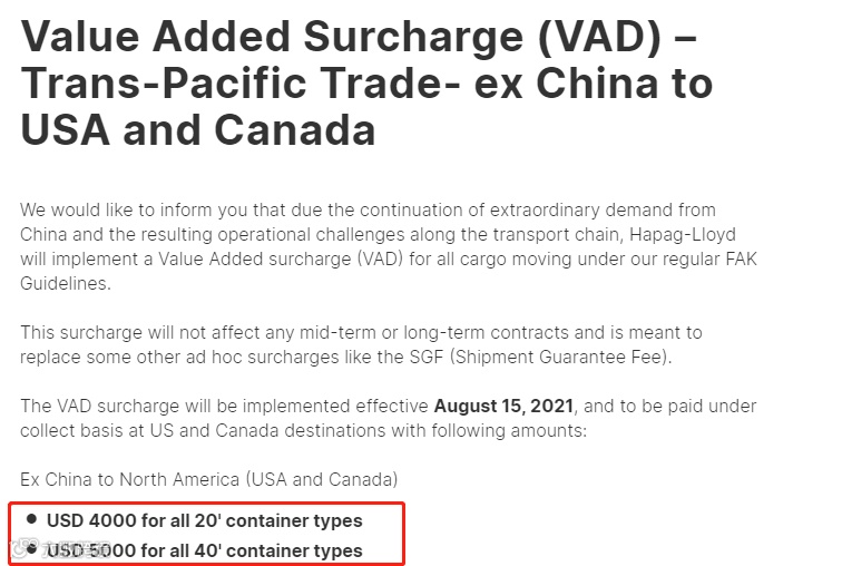 全球第五大集装箱班轮公司、德国航运巨头赫伯罗特日前发布公告:将对中国出口美国和加拿大的货物加收增值费 Value Added surcharge (VAD)。