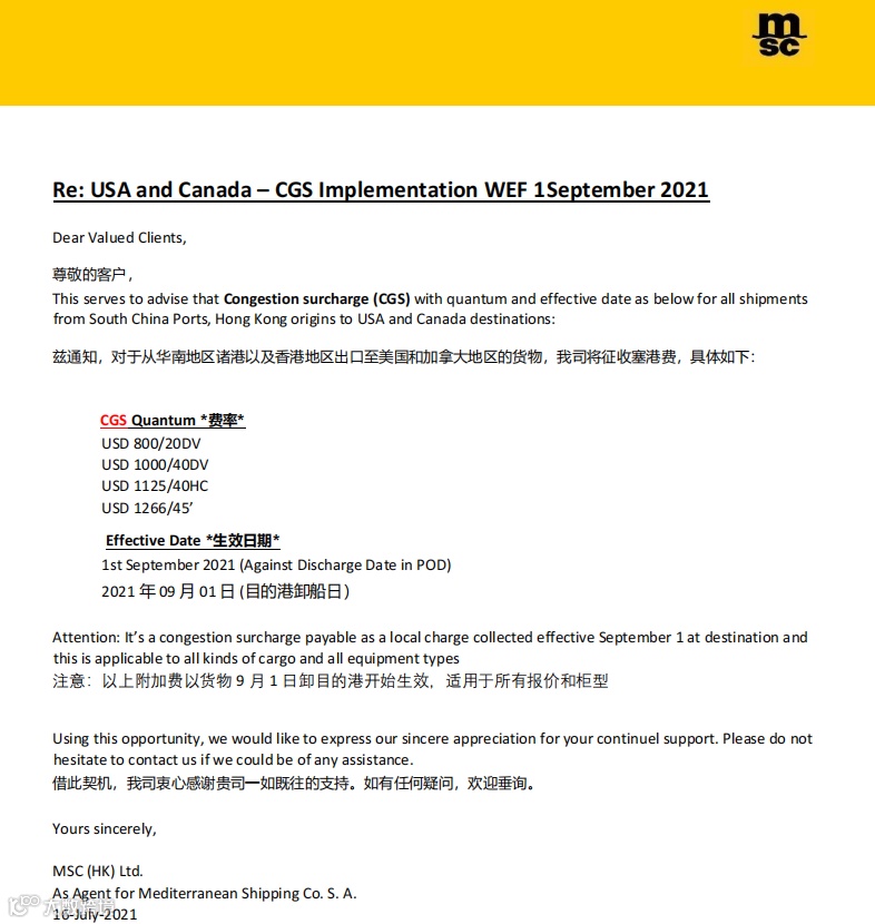 上周五,MSC发布公告称:对于从华南地区诸港以及香港地区出口至美国和加拿大地区的货物,我司将征收塞港费,具体如下: