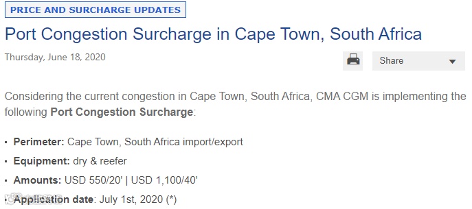 日前,船公司CMA CGM宣布,将对开普敦的干货集装箱和冷藏集装箱收取拥堵费,550美元/20尺柜,1100美元/40尺柜,7月1日生效。