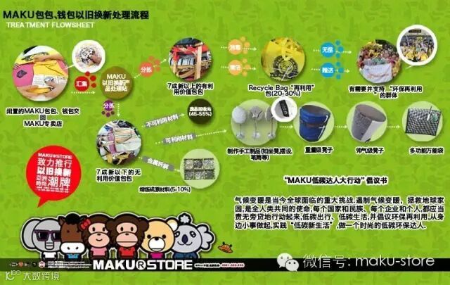 1. 致力推行“以旧换新”,针对包袋、钱包、T恤、皮带系列,顾客用旧用坏的产品只需支付少量费用,即可任选新款产品,不设时间限制,而且“以旧换新”之后的产品还可以继续“以旧换新”,将旧产品回收并进行环保处理的做法运用到潮流产品中,而且成为一种终身的售后服务,令顾客享受实惠之余,也参与了环保活动,令MAKU产品大受欢迎!