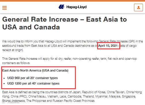 赫伯罗特征收东亚至美国和加拿大GRI赫伯罗特官网3月12日发布通知,自2021年4月15日(date of cargo receipt at origin)起,将在从东亚到美国和加拿大所有目的地的东行航线实施以下GRI。