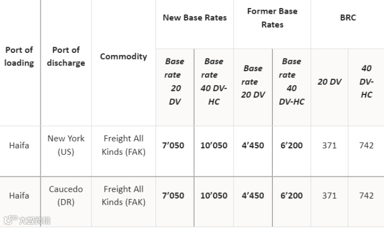 该航运公司将对从以色列海法港到纽约和考塞多的货物征收 FAK 费率。每 20 英尺增加 2,600 美元,每 40 英尺和 HC 标准集装箱增加 3,850 美元。