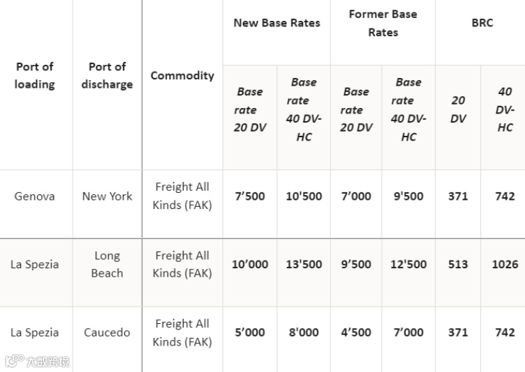 此外,MSC 将提高从意大利拉斯佩齐亚和热那亚港口转运到纽约、长滩和考塞多的 20'、40' 和高立方 (HC) 干货集装箱的 FAK 费率。