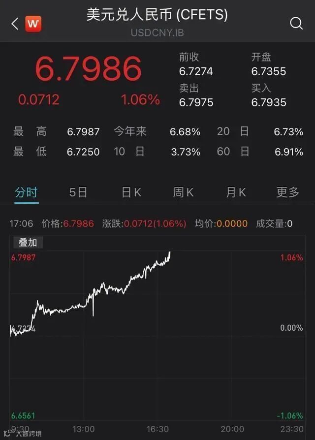 5月12日,人民币对美元即期汇率盘中接连跌破6.74、6.75、6.76、6.77、6.78、6.79关口,16:30收盘报6.7900,较上一交易日跌626个基点。这一收盘价创下了2020年10月以来的新低。进入夜盘交易时间后,人民币对美元即期汇率一度逼近6.80关口。