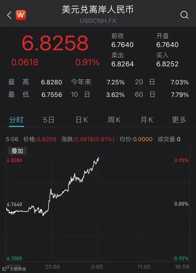 5月12日,离岸人民币对美元汇率盘中接连跌破6.77、6.78、6.79、6.80、6.81和6.82关口,较前一交易日下跌超过550个基点。相比在岸市场,离岸人民币今年的跌幅更大,累计下跌超过7%。