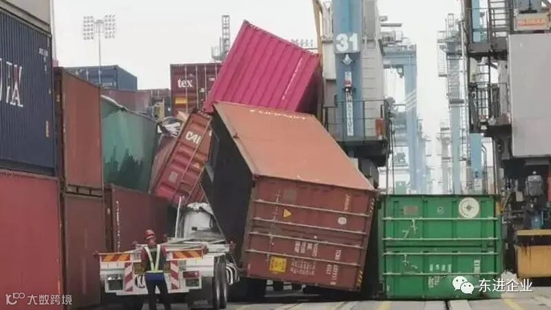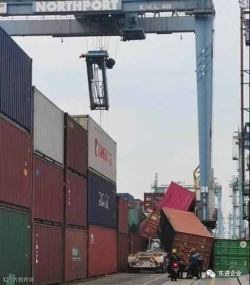 2019年4月巴生港,集装箱严重超重,龙门吊钢绳断裂,集装箱掉落,拖车被砸。