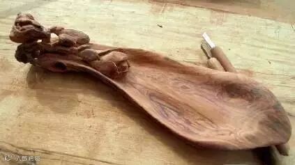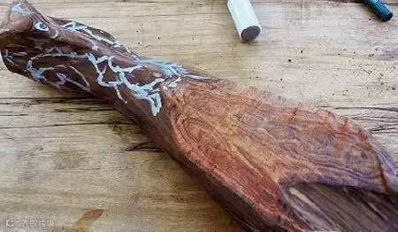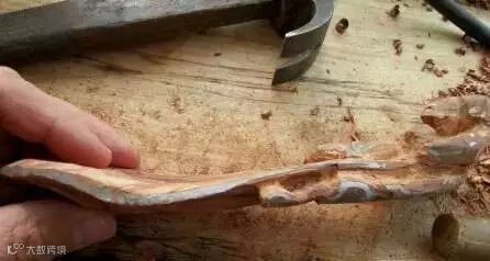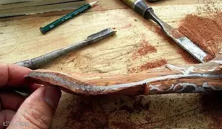 用白色粉笔画出各部位的大致轮廓。锯掉稍宽一端的棱角,使木料呈大花瓣型。根据料本身走势,安排设计布局,尽量保留原有体量,为方便起见用尖刀划出大体轮廓。