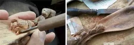 凹面用圆铲继续修整,平底凸面则用扁铲。注意吃刀要小,不可造成二次破坏。