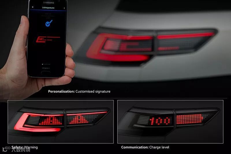 不仅如此,在大众所公布,疑似新一代高尔夫或者I.D.电动车尾灯设计的概念预览图中,也把尾灯视作是与车主沟通的管道。可以传递包括车辆的充电状态等信息,无须透过App等远端应用程序,直接就可以把车辆的电量信息显示在尾灯上,清楚明白的让车主了解。