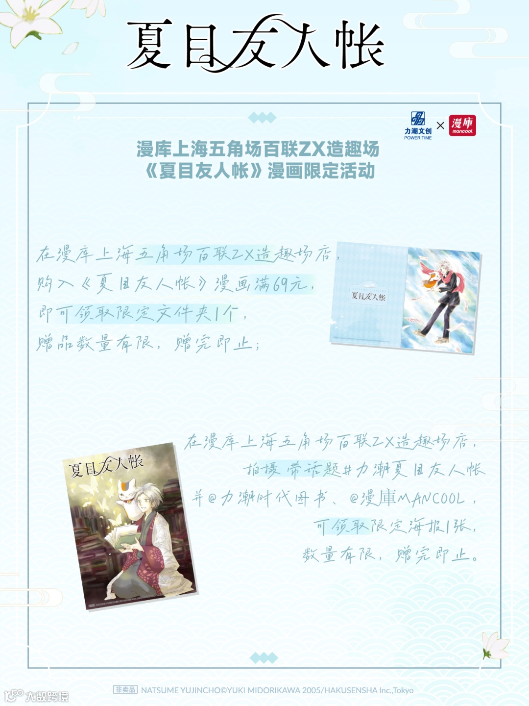 1、7月11日起,在漫库上海百联ZX造趣场店,购入《夏目友人帐》漫画满69元,即可领取限定文件夹1个,赠品数量有限,赠完即止;