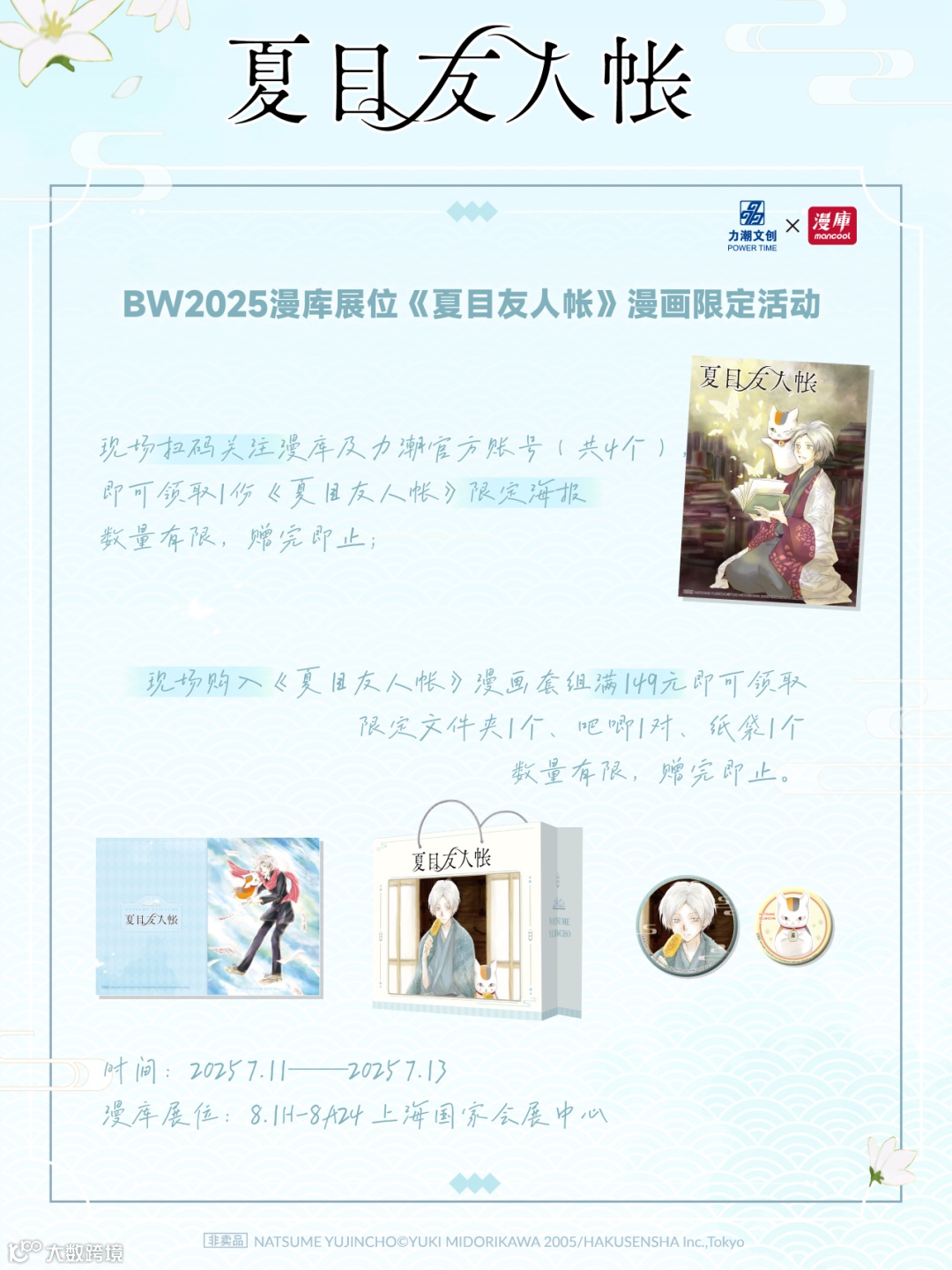 2、在BW2025现场漫库展位,购入《夏目友人帐》漫画套组满149元,即可领取限定文件夹1个、限定吧唧1对、限定纸袋1个,赠品数量有限,赠完即止。