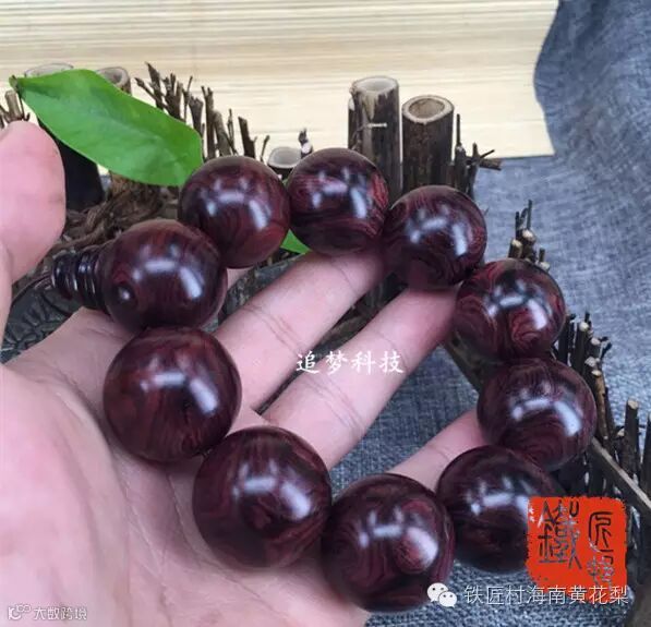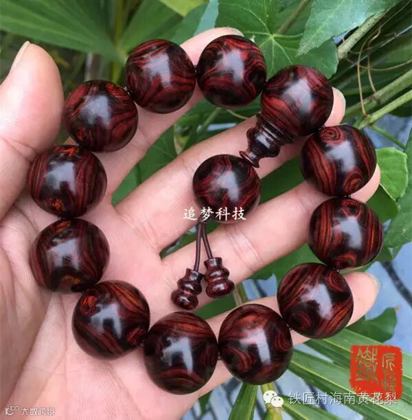 黄花梨的底色为黄红褐色为多,紫、黑色料极为稀缺。整体颜色不单一,变化大。体现在珠子上的颜色由深慢慢过渡到浅再到深。且往往是几种颜色交错相融,给人感觉色泽丰富,就是说不出整体什么颜色那种感觉,在不同光线下体现的主色也有所差异。色系虽多却很纯正,底色干净、清澈靓丽且十分稳定。
