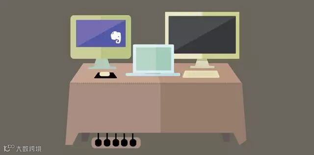 你的办公桌装配了最先进的设备,有多个液晶显示屏和各种接头的充电器。