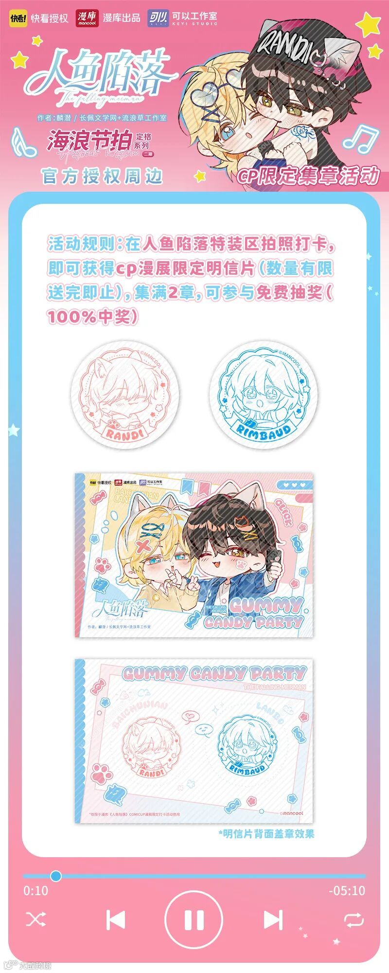 4、限定明信片集齐2枚印章,即可参与《人鱼陷落》马口铁徽章盲盒抽奖1次(100%中奖)