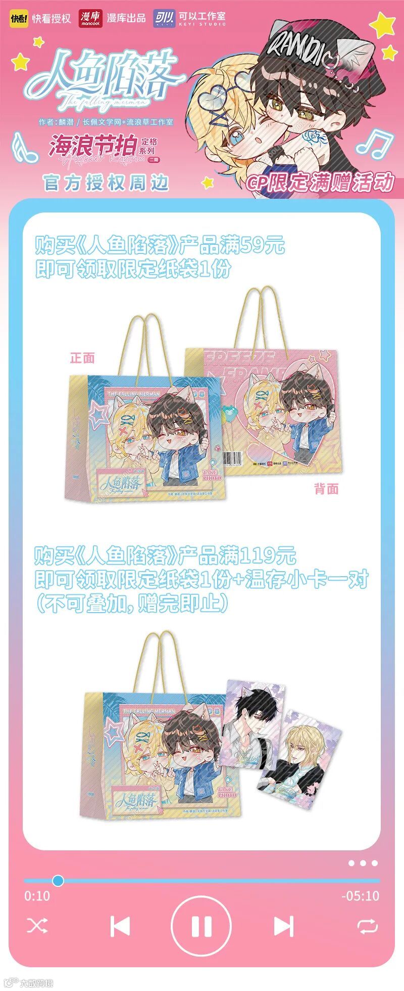 购买《人鱼陷落》产品满119元即可领取限定纸袋1份+温存小卡一对。(赠品不可叠加,赠完即止)