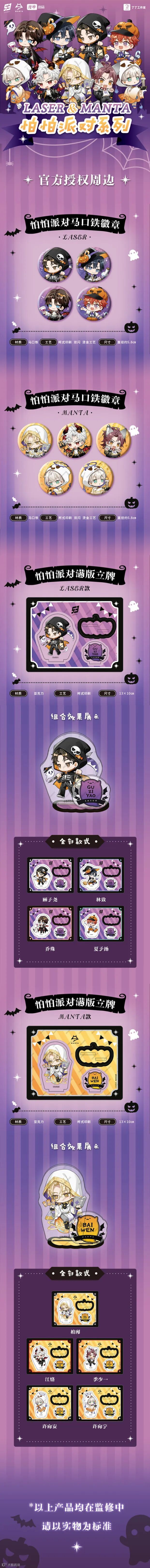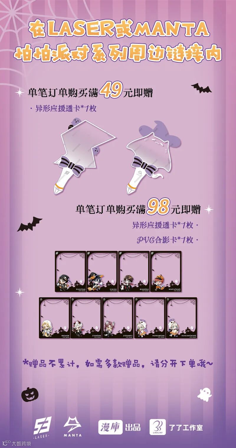 单笔订单ALL IN【LASER】或【MANTA】万圣节系列周边,即赠该队应援棒透卡1枚和该队角色PVC合影卡全员