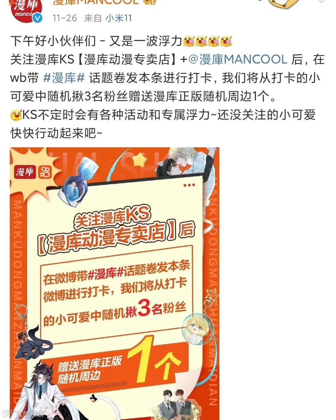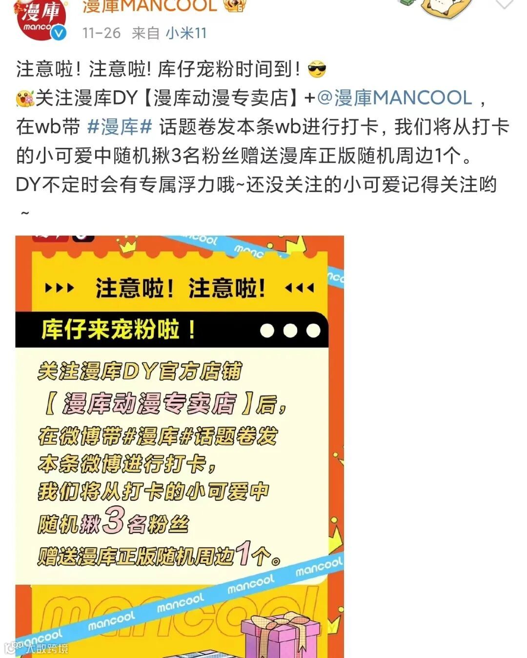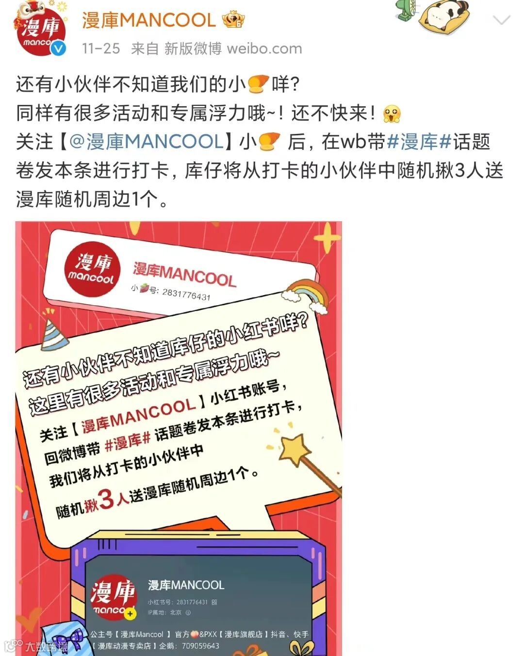 2、关注库仔的抖音、快手、小红书账号后,回微博,在微博带 #漫库# 话题,在以下图中的原微博参与转发打卡活动。库仔将从打卡的小可爱中随机揪3名粉丝赠送漫库正版随机周边1个。