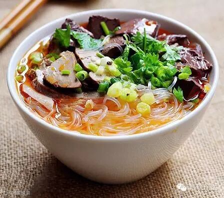 鸭血粉丝汤是镇江、南京著名的风味小吃,由鸭血、鸭肠、鸭肝等加入鸭汤和粉丝制成。口感鲜香,爽口宜人。