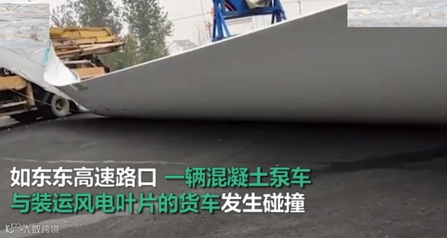 几百万没了,江苏一泵车与货车相撞,巨大风电叶片撞弯报废