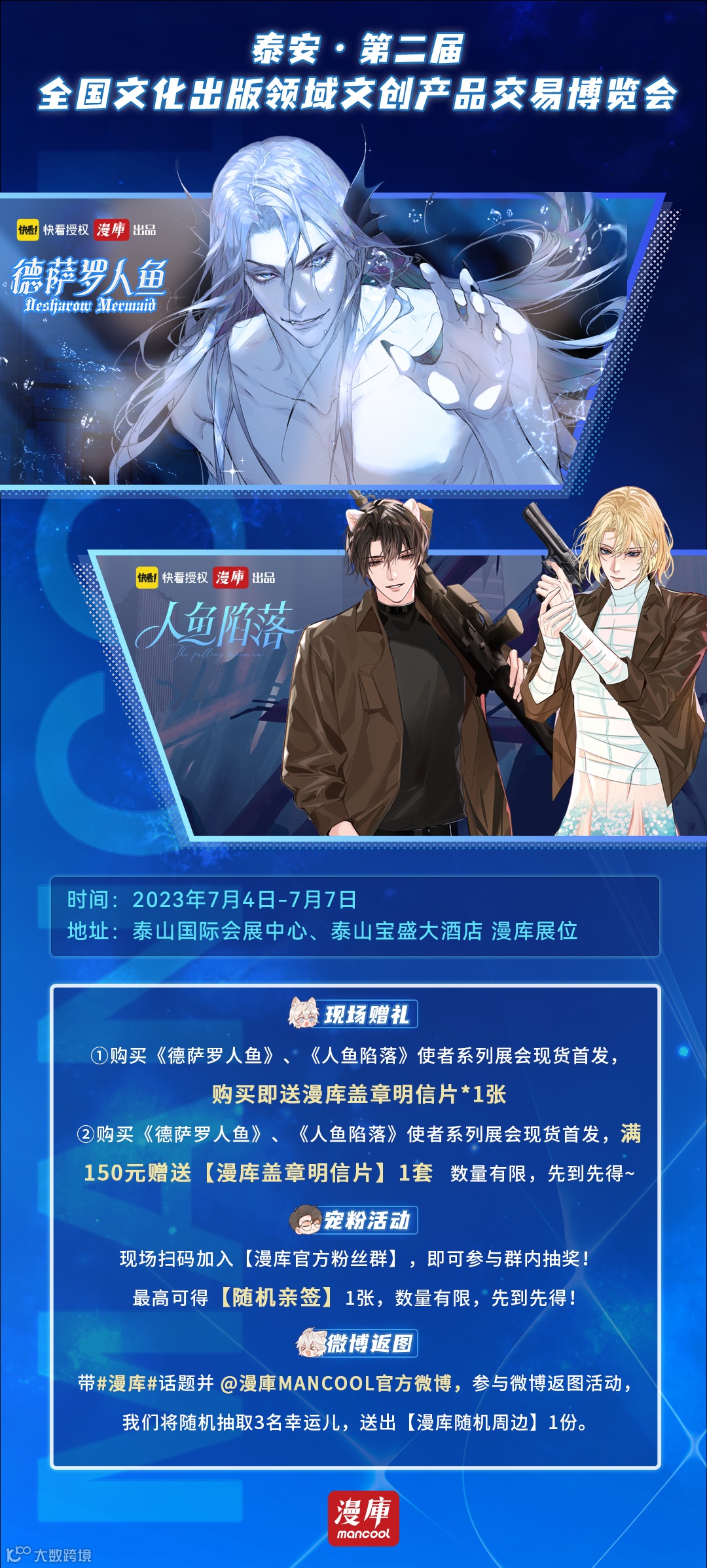 购买《德萨罗人鱼》、《人鱼陷落》使者系列展会现货首发,满150元赠送漫库盖章明信片1套,数量有限,先到先得。