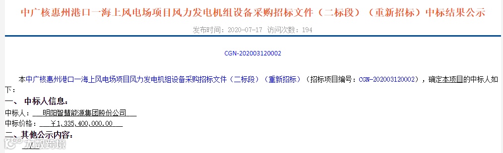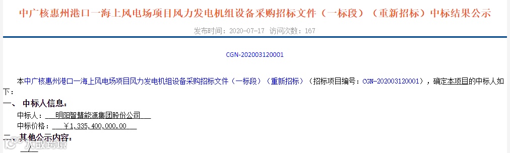 中广核惠州港口海上风电场项目位于广东省惠州市惠东县港口镇附近海域,风电场总规划装机容量1000MW。本工程为中广核惠州港口海上风电场项目一期工程,规划装机容量为400MW。本期场址东西向宽约6.5km,南北向最长约10.7km,规划面积约64.8km2,水深在30m~43m之间,距离陆地最近距离约25km。本招标项目划分为2 个标段,本次招标内容为:一标段。本次招标的供货范围要求提供全新制造、技术先进、性能稳定、安全可靠、包装完整的成套并网型风电机组及相关服务和质保期服务。