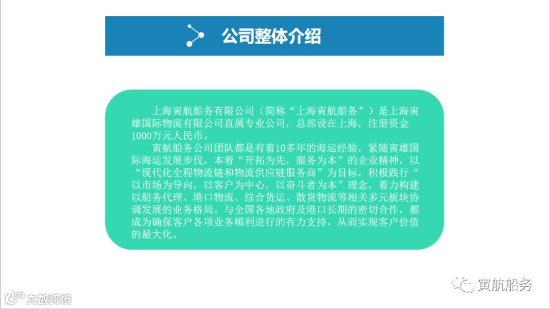 上海寅航船务有限公司(简称“上海寅航船务”)是上海寅雄国际物流有限公司直属专业公司,总部设在上海,注册资金1000万元人民币。
