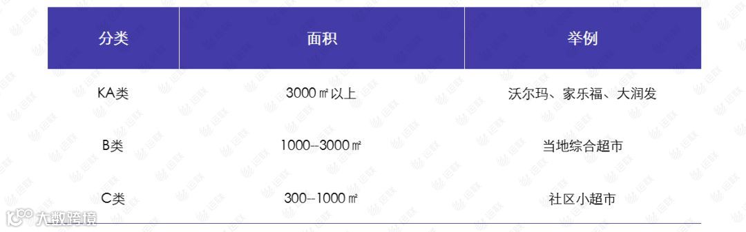 KA商超主要指国内国外大型连锁超市、卖场,单店面积至少拥有3000平方米以上,如沃尔玛、家乐福、大润发等。B类卖场指的是国内中等规模的超市,商场经营面积在1000平方米到3000平方米之间。C类卖场的经营面积一般在300平方米到1000平方米之间,基本分布在郊区。