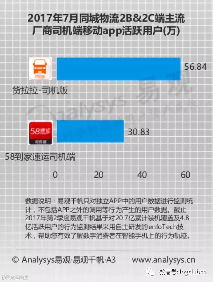 Analysys数据显示,2017年7月同城物流2B&2C端主流厂商司机端移动app活跃用户,货拉拉活跃司机数达到了56.84万,58速运则达到了30.83万。用户方面,官方数据显示,货拉拉拥有2000万注册用户,58速运则为800万。整个市场环境下近3000万的注册用户和近100万的活跃司机已经将城墙壁垒,外部想要进入在现行环境下,几乎不存在任何可能。