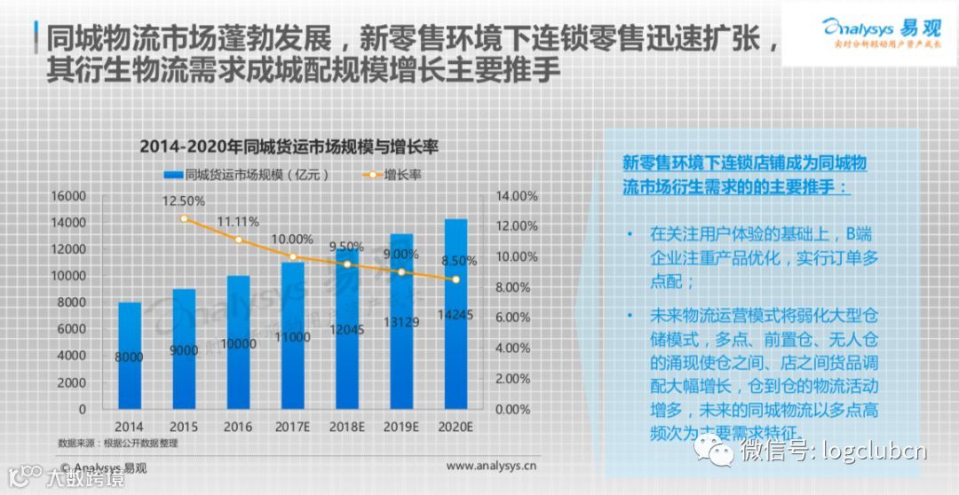 Analysys 认为,新零售环境下的连锁零售的迅速扩张后的衍生物流需求的增长是同城货运迅速增长的主要原因。