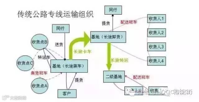 公路快线:也就是卡车航班,是航空代理衍生出 来的零担运输模式,也是主要提供中心城市为点到点的跨省长途干线运输,一般只经营“点到点”运输,面向同行收货,部分第三方物流有直客货源(打“擦边球” 赚取超额利润)。相对普通的公路专线,公路快线时效更有保证,部门热门中心城市互通,如华南到华东,华南到华中等中心城市,公路快线时效比航空运输差不了 多少,尤其是周末发货,对客户来讲,时效上都能接受,但价格比航空低2-5 倍,非常具有市场竞争力。如图: