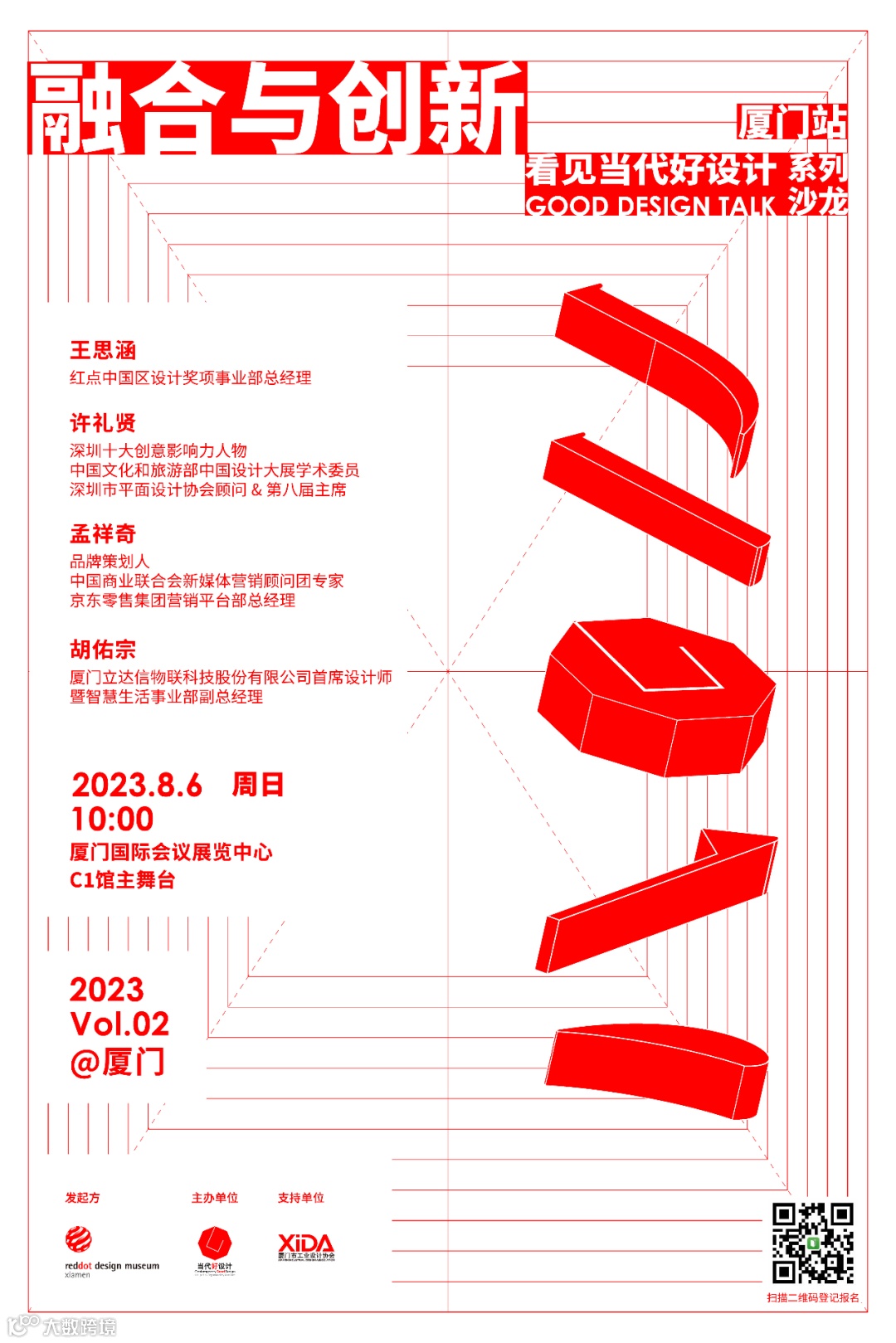2023年8月4日至7日,第十四届海峡两岸(厦门)文化产业博览交易会即将在福建厦门举办。「看见当代好设计Good Design Talk」也将于8月6日来到厦门,作为海峡两岸文博会的系列活动之一,携手支持单位厦门市工业设计协会以「融合与创新」为主题开展沙龙论坛。邀请红点中国区设计奖项事业部总经理王思涵、深圳十大创意影响力人物,中国文化和旅游部中国设计大展学术委员,深圳市平面设计协会顾问 & 第八届主席许礼贤、品牌策划人,中国商业联合会新媒体营销顾问团专家,京东零售集团营销平台部总经理孟祥奇、厦门立达信物联科技股份有限公司首席设计师暨智慧生活事业部副总经理胡佑宗作为分享嘉宾,从多个维度及视角出发,一起探讨当代好设计。