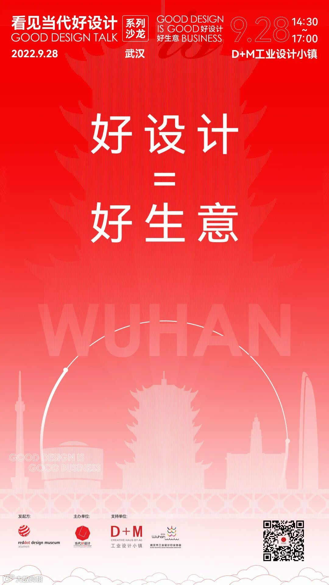 2022年「看见当代好设计Good Design Talk」将于9月28日走进武汉,携手支持单位D+M工业设计小镇、武汉市工业设计行业协会,以「好设计=好生意」为主题开展沙龙论坛,邀请墨谷整合设计(武汉)有限公司副总经理杨翔,邻汇吧华中大区总经理江偲,广州引力波信息科技有限公司副总经理郭缵以及红点设计博物馆·厦门设计中心总经理苏楠作为分享嘉宾,共同探讨设计创造价值的无限可能。