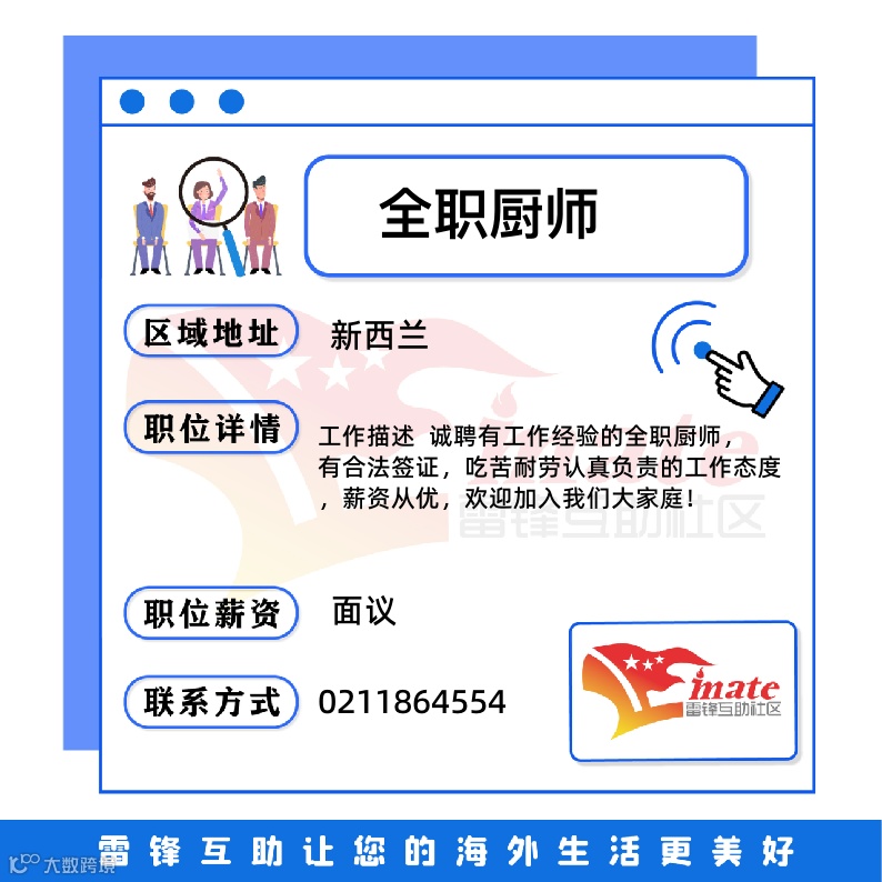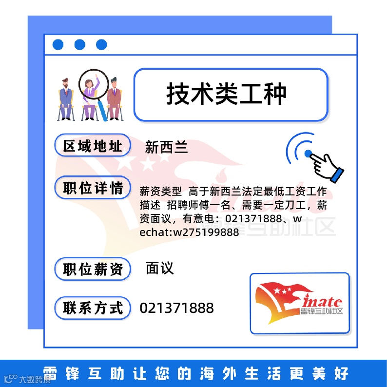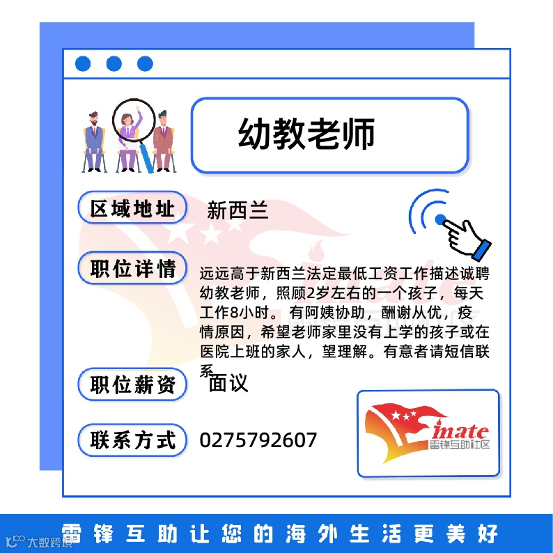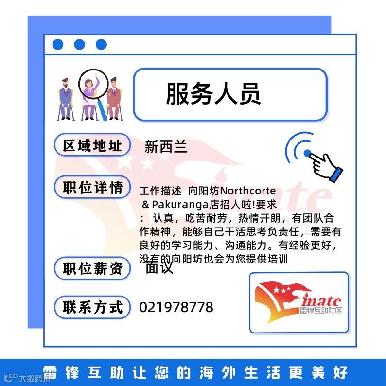 新西兰便民|招聘|幼教、服务员、厨师、技术工