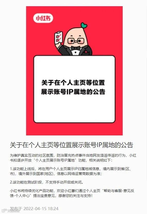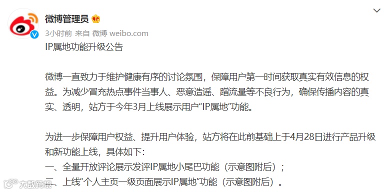 4月28日,新浪@微博管理员 ,正式发布IP属地功能升级公告:即日起,平台全量开放评论展示发评IP属地小尾巴功能,上线“个人主页一级页面展示IP属地”功能。